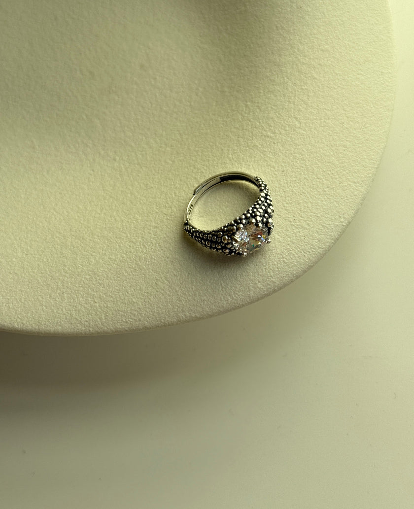 Meraviglioso anello regolabile in argento 925 bianco con particolare trama puntinata e luminosissimo zircone bianco incastonato.
