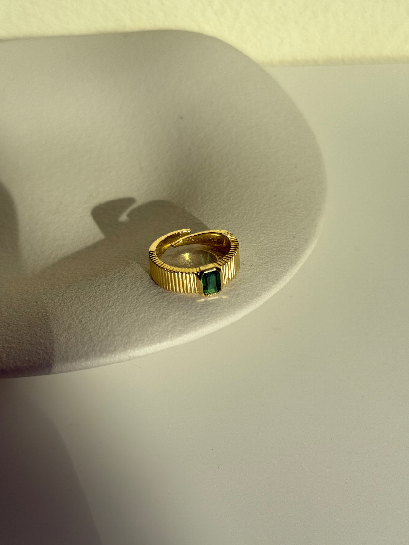Particolare anello in argento 925 placcato oro giallo con zircone rettangolare centrale di colore verde intenso montato su una struttura solida con trama a righe.