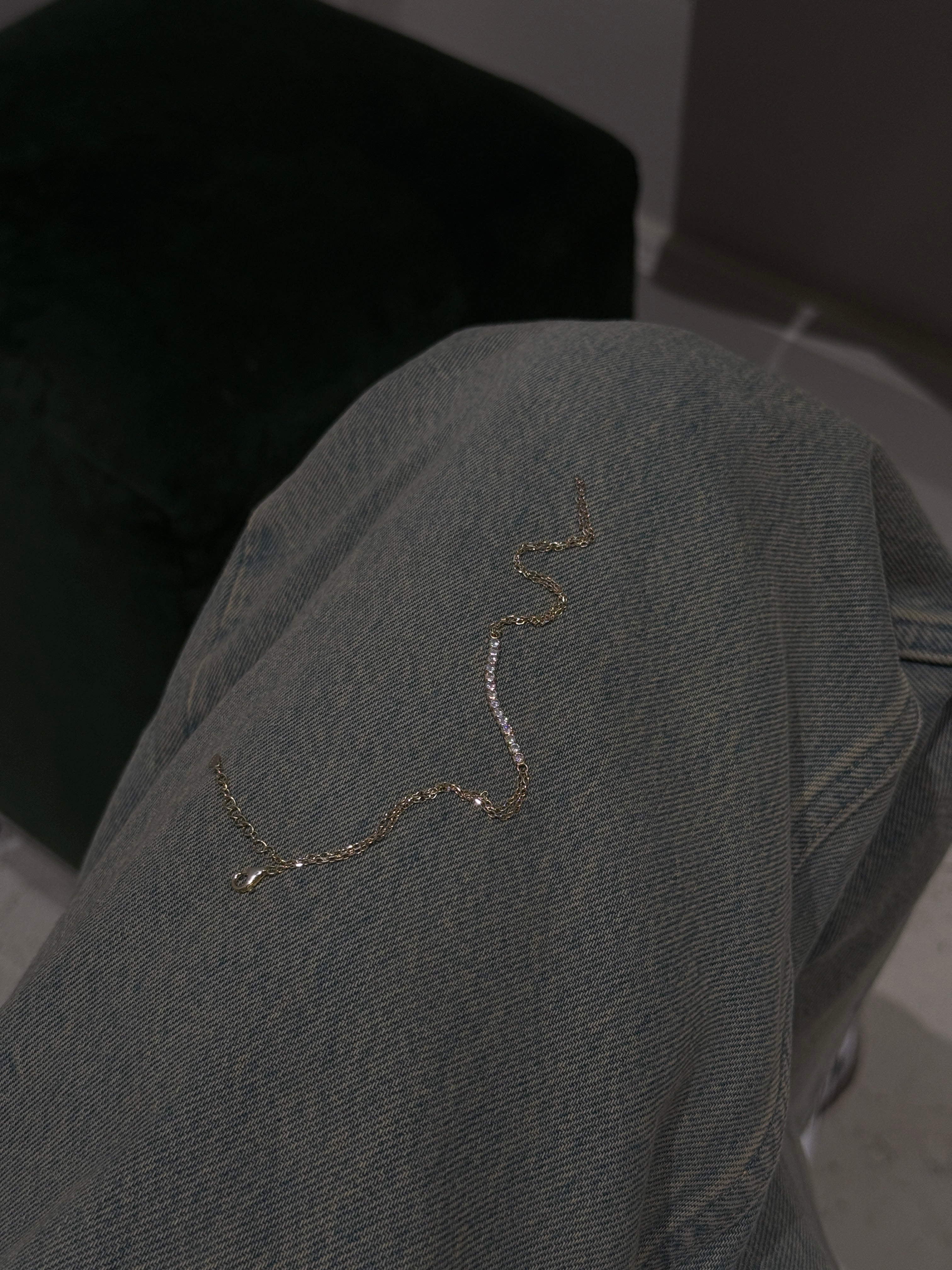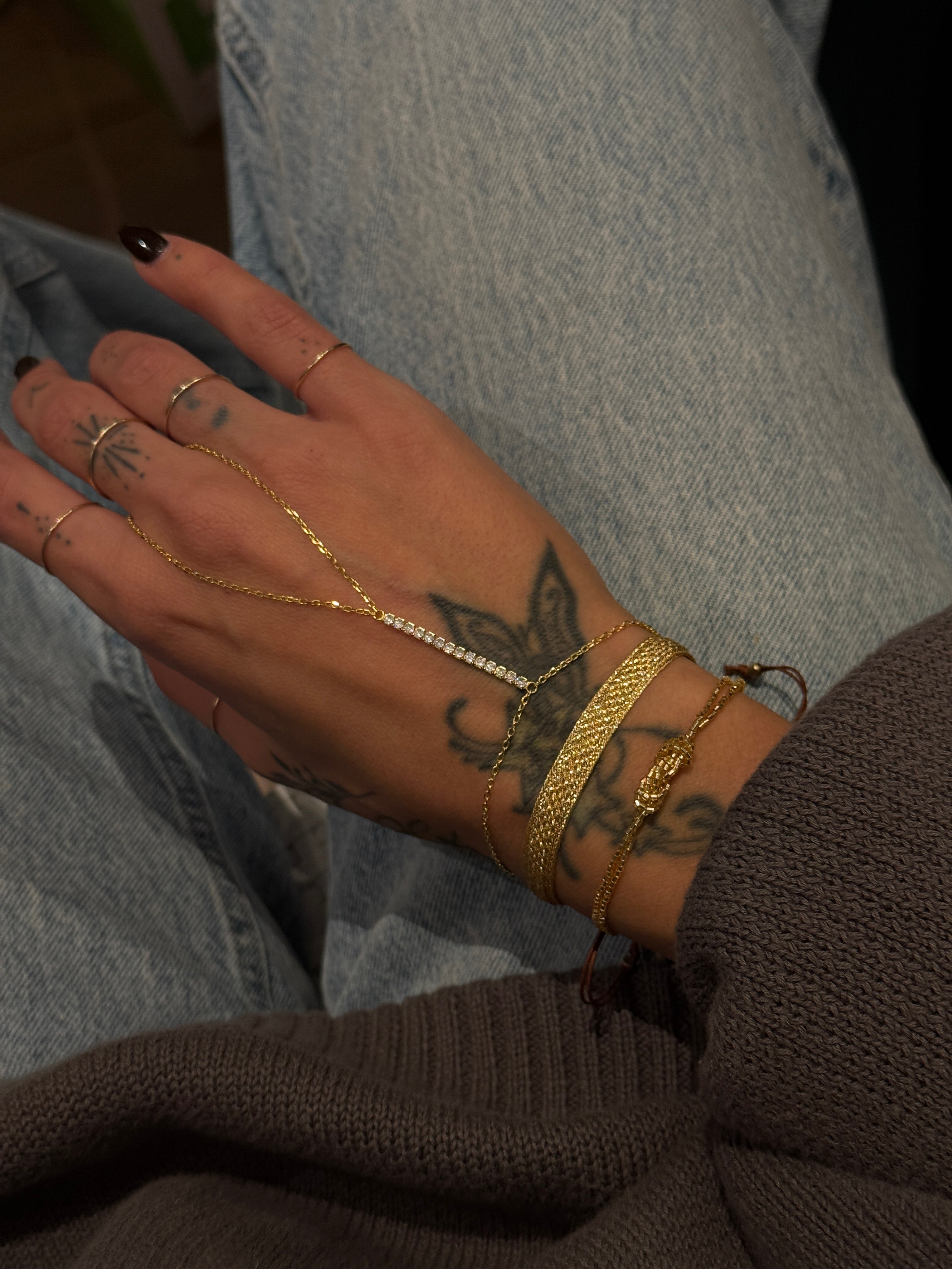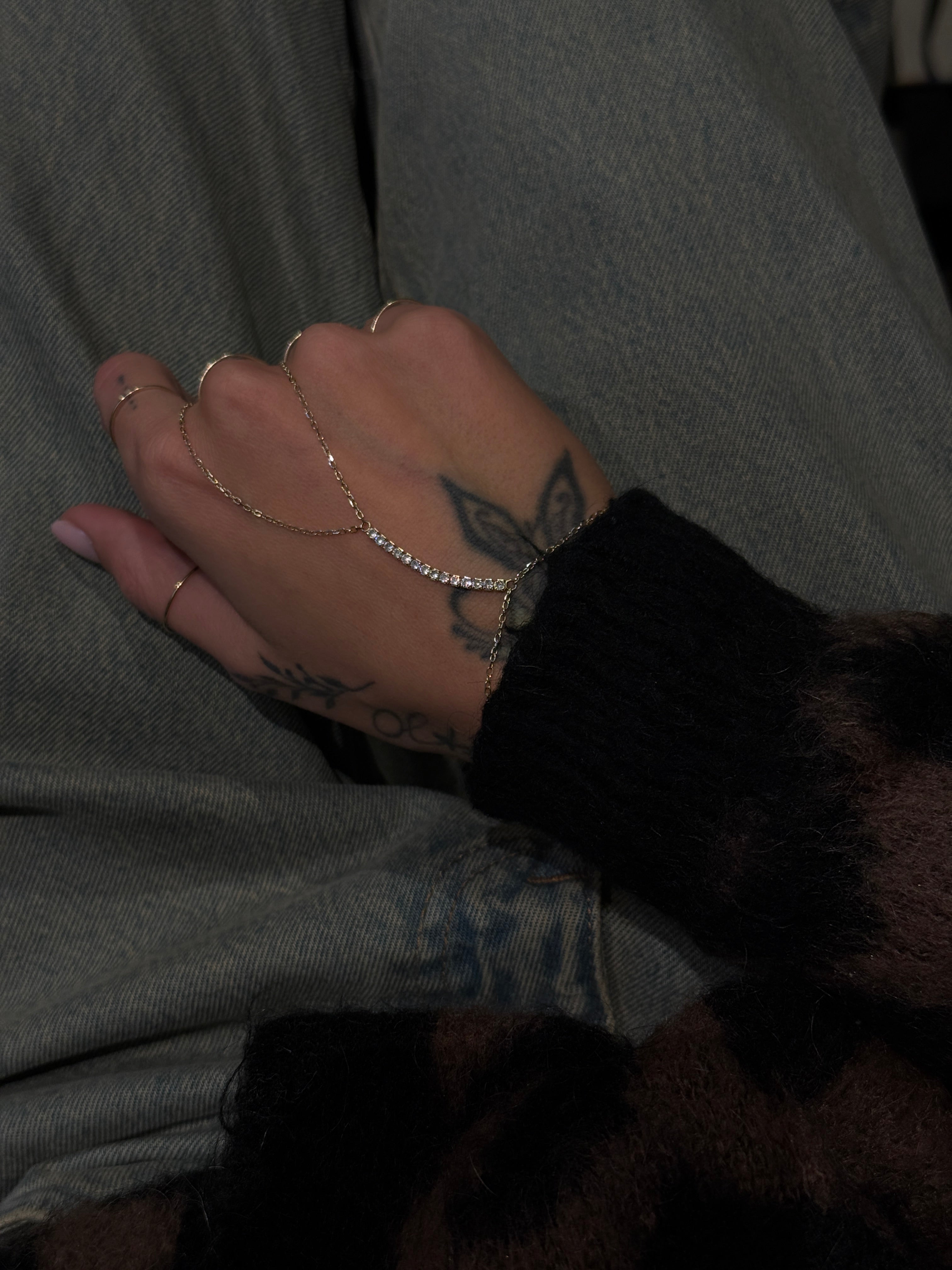 Meraviglioso gioiello baciamano con catena sottile e luminosa con una fila di zirconi bianchi in stile tennis. Versatile ed estremamente luminoso.
