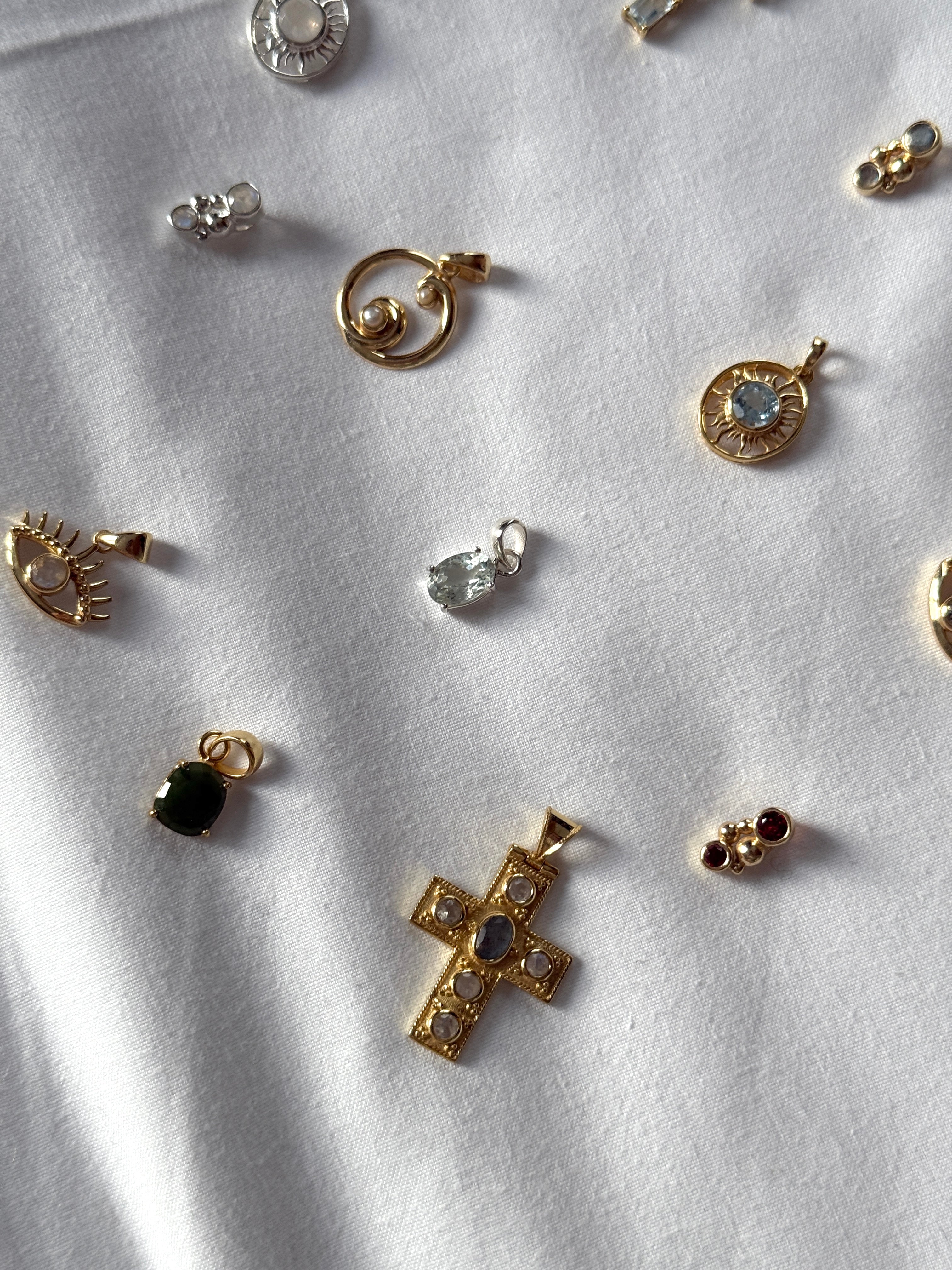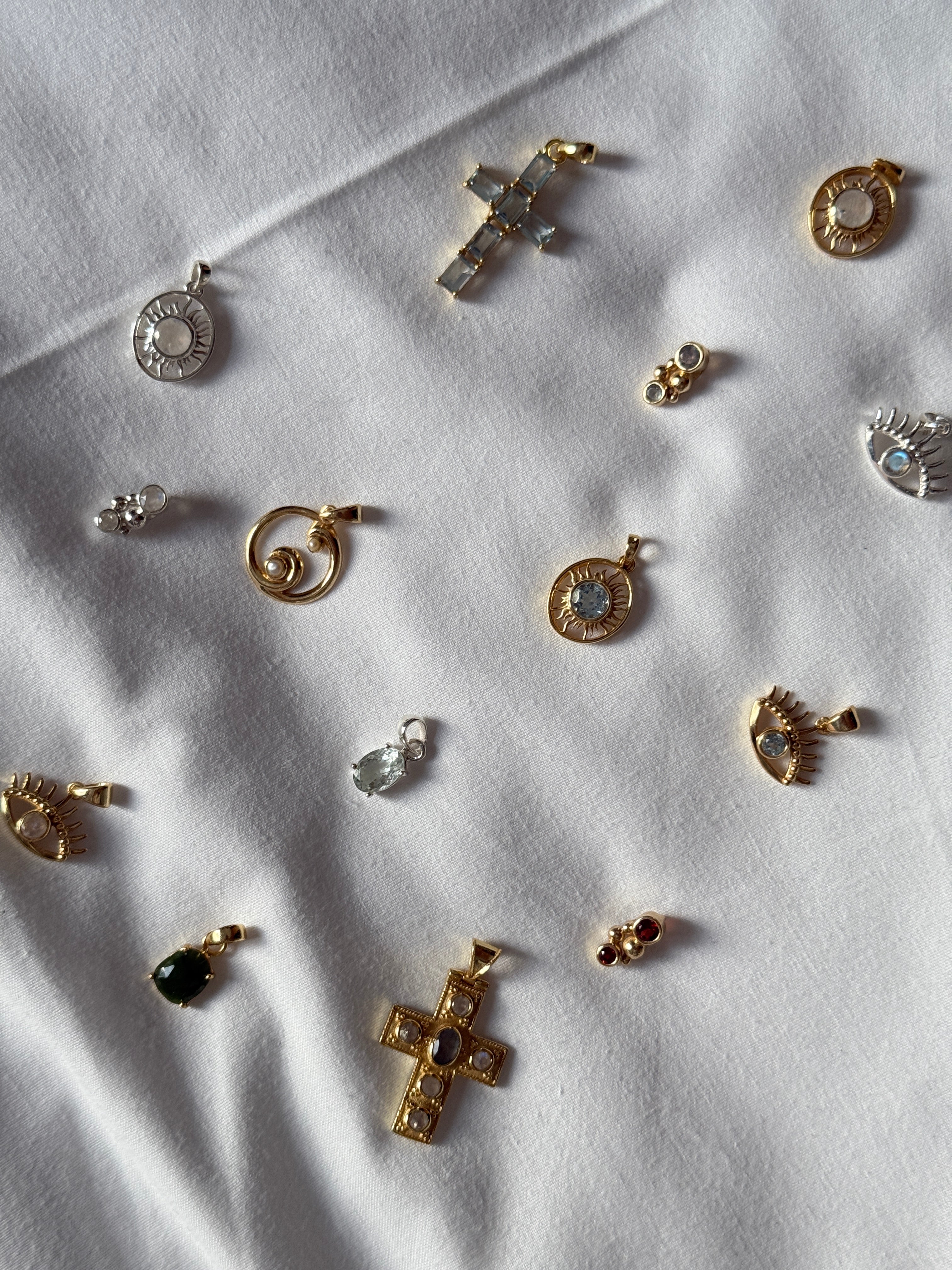 Una selezione di ciondoli simbolici e raffinati, ispirati alla spiritualità, alla protezione e all’energia della luce. La collezione unisce forme iconiche come occhi, soli, croci e spirali, reinterpretate in chiave moderna e minimale.