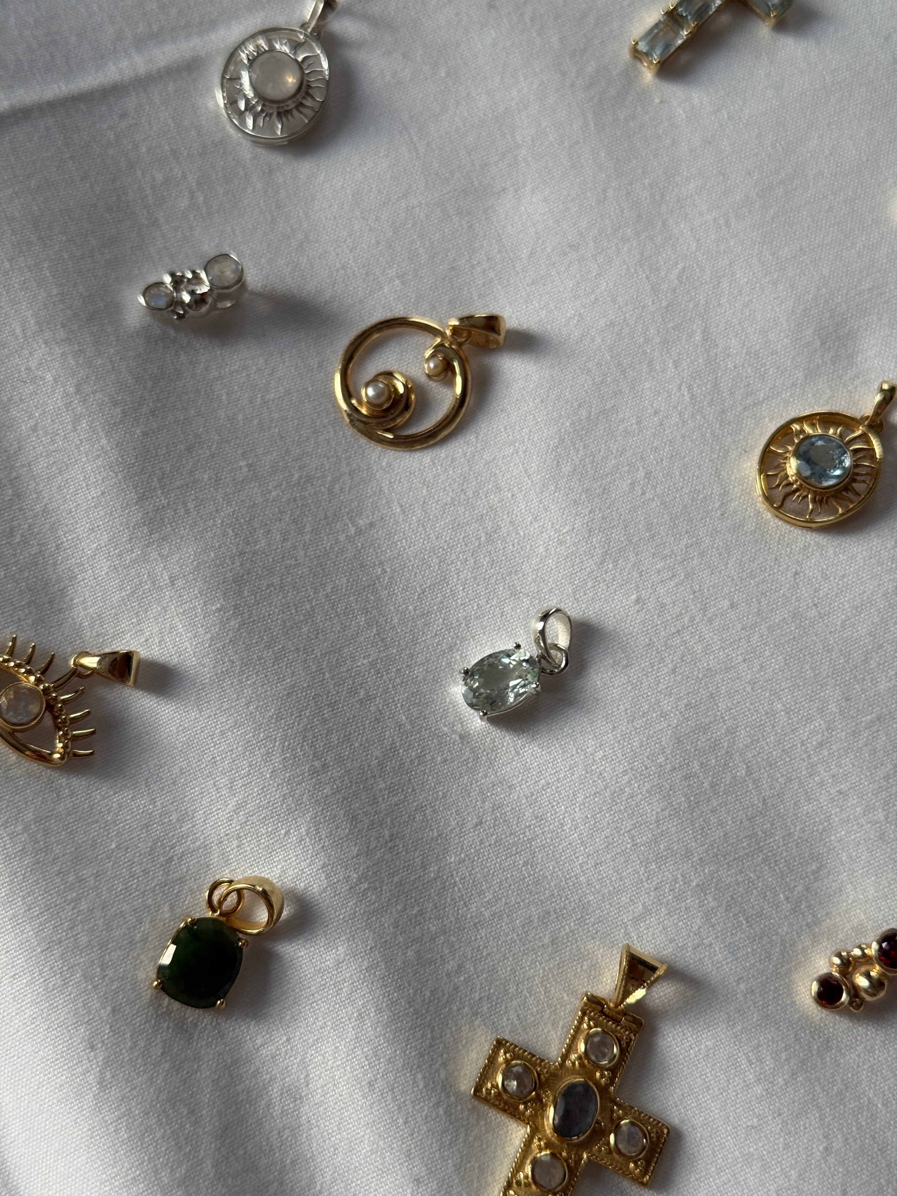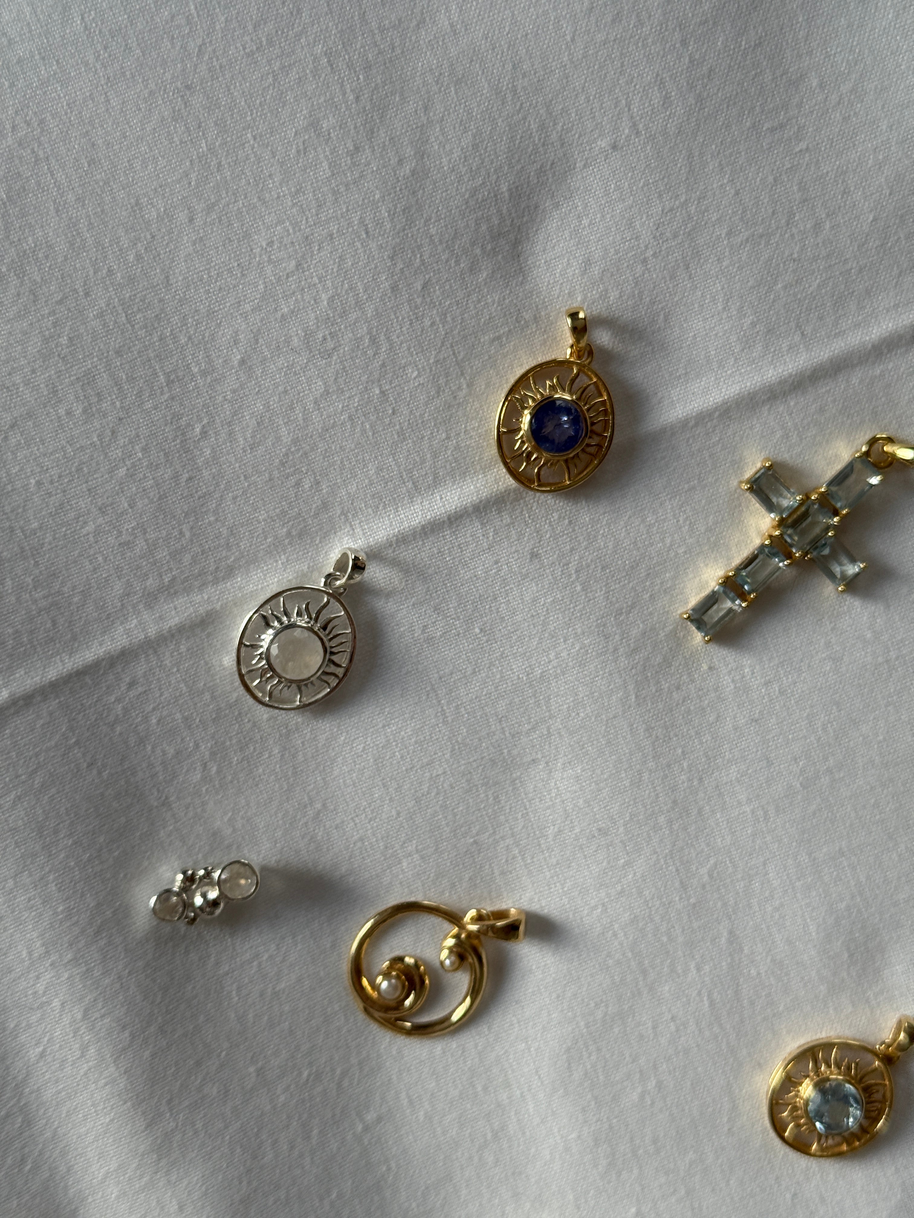 Realizzati in argento 925 e argento placcato oro, i ciondoli sono impreziositi da pietre naturali selezionate che riflettono delicatamente la luce, creando un equilibrio perfetto tra eleganza e significato. Ogni pezzo è pensato come un piccolo talismano personale, da indossare ogni giorno o da sovrapporre ad altri per uno stile unico e contemporaneo. Pezzi unici.