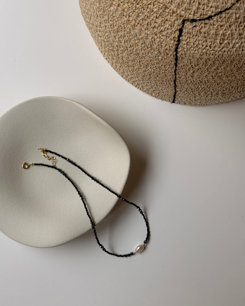 Una collana dal carattere essenziale e sofisticato, in cui il nero profondo delle piccole pietre di spinello nero ed ematite, creano un elegante contrasto con la delicatezza di una perla naturale. Un equilibrio armonioso tra luce e ombra, pensato per chi ama i dettagli discreti ma ricercati. Leggera e versatile, accompagna con naturalezza sia i look quotidiani sia quelli più eleganti. Indossata da sola aggiunge un tocco deciso e raffinato; abbinata ad altre collane crea un effetto moderno e personale.
