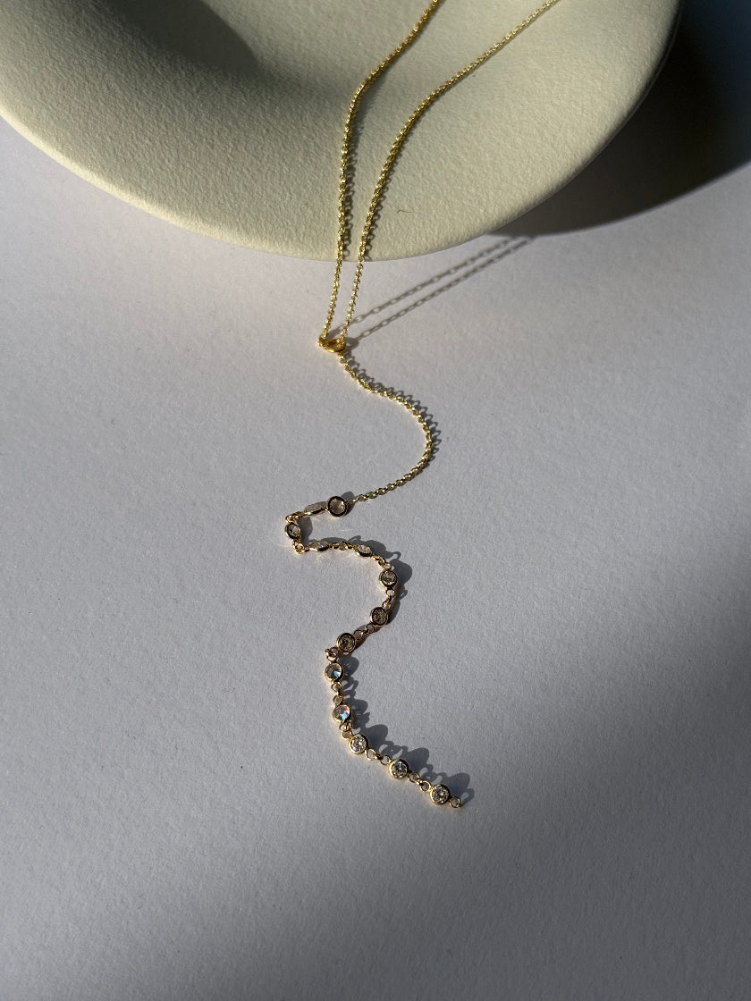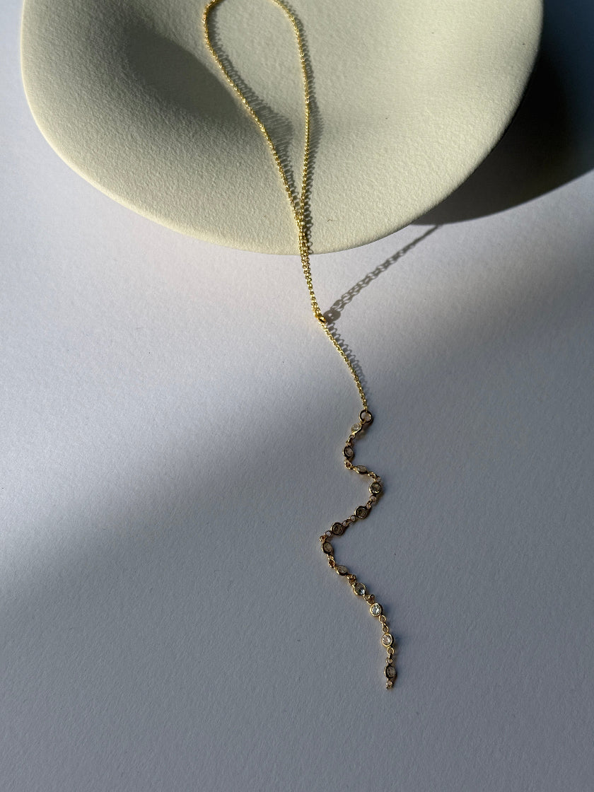 Collana in argento 925 galvanizzato oro giallo modello a Y con catena rolò diamantata e catena con zirconi nella parte pendente.