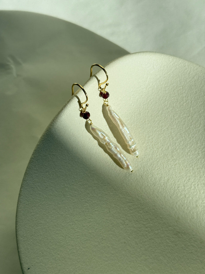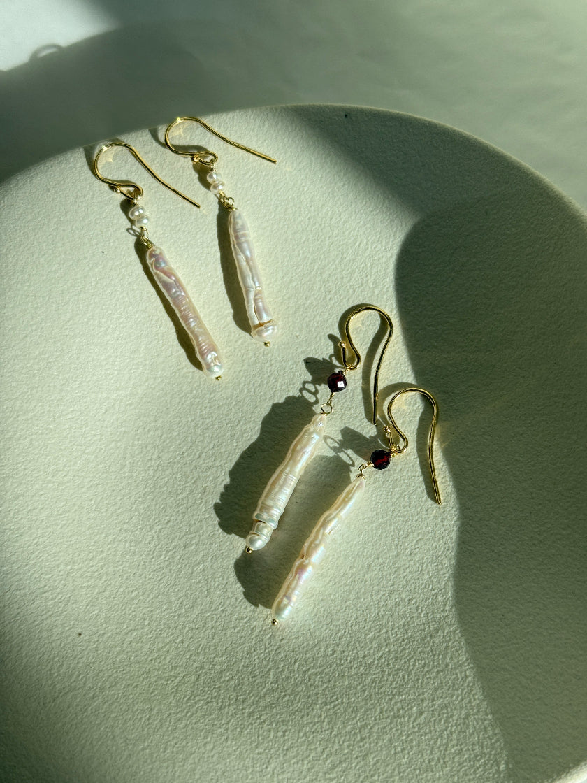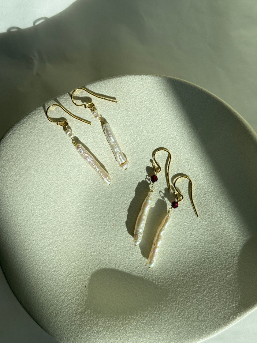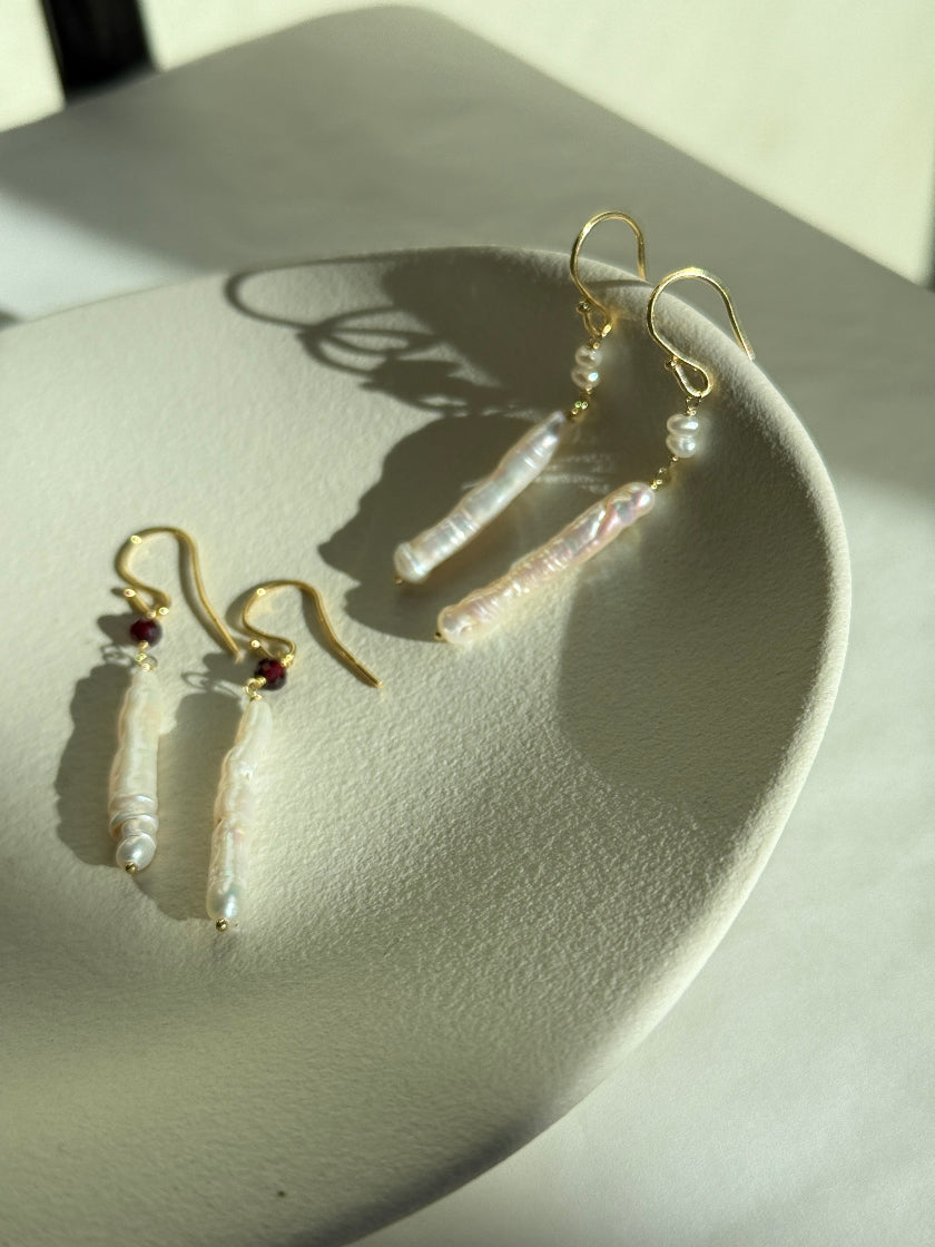 Orecchini in argento 925 placcato oro 18k con perla barocca naturale allungata e un piccolo dettaglio sopra la perla, che li rende ancora più eleganti.