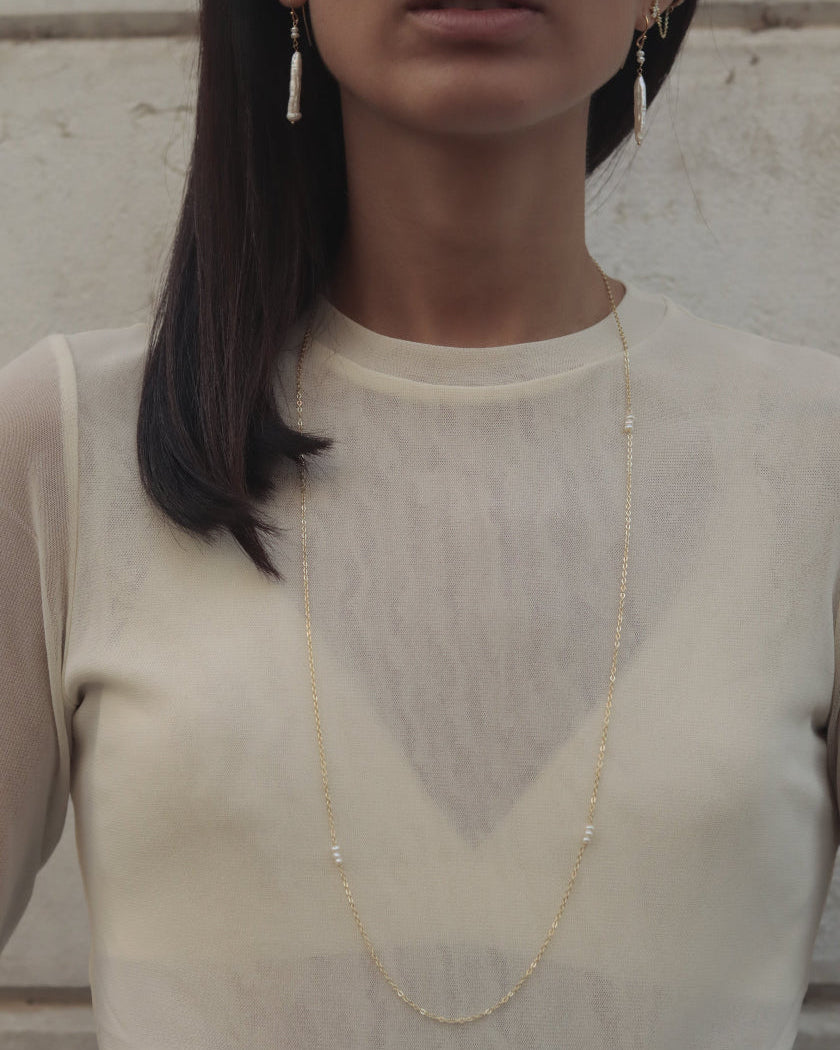 Collana lunga in argento 925 placcato oro 18k con una catena forzatina alternata a piccole perle naturali.