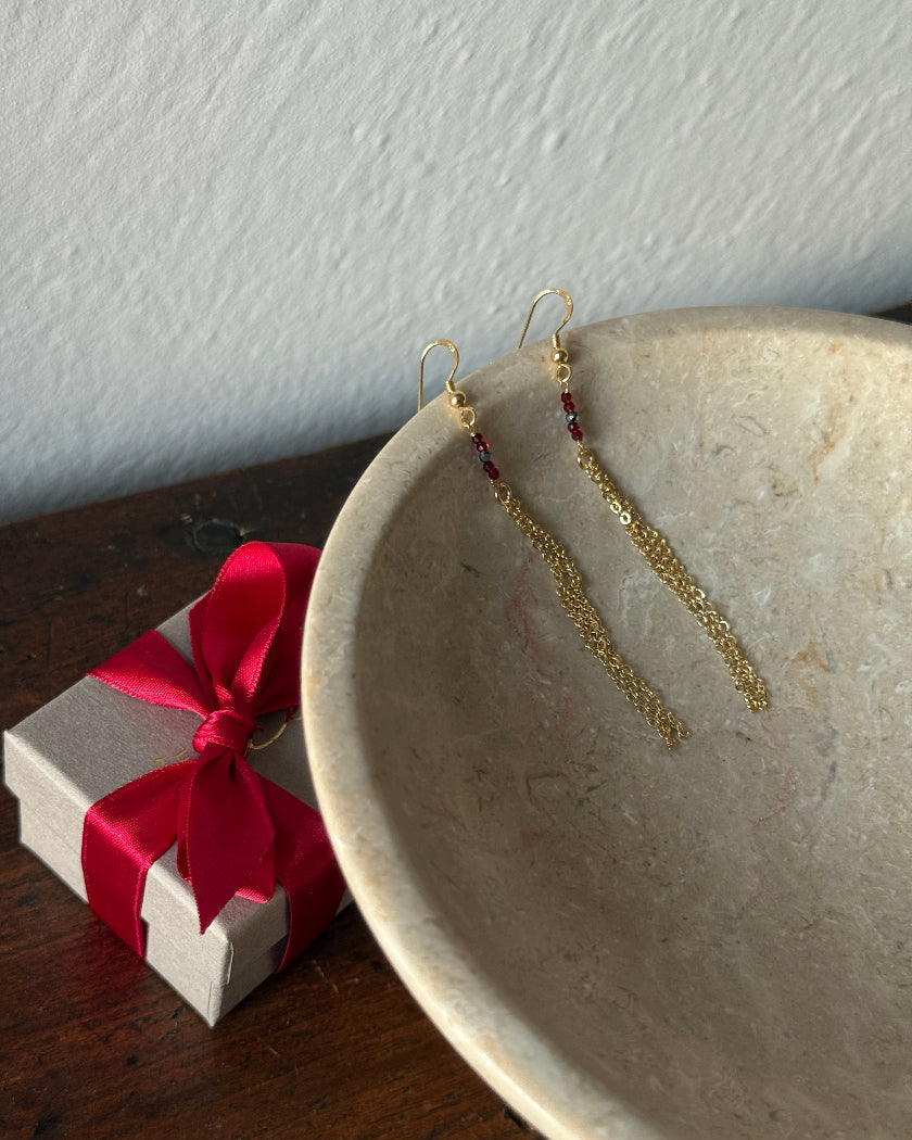 Luminosissimi orecchini in argento 925 placcato oro 18kt con catene pendenti e micro cristalli colorati