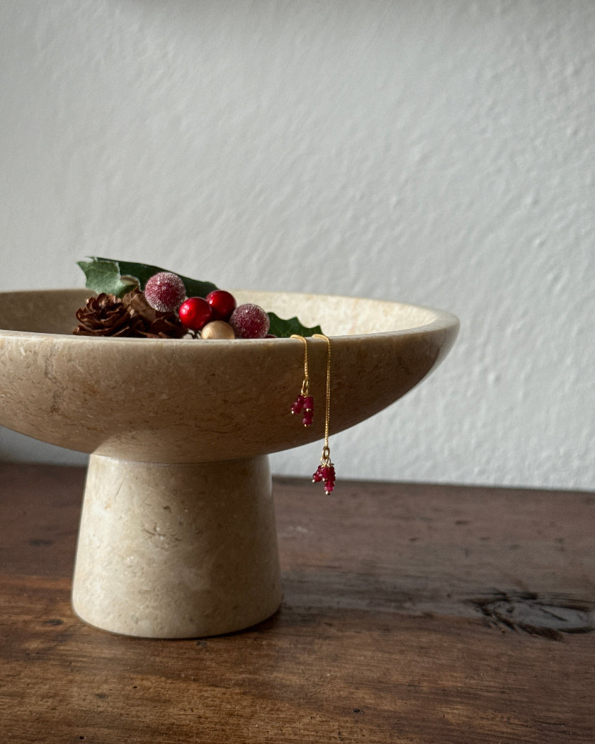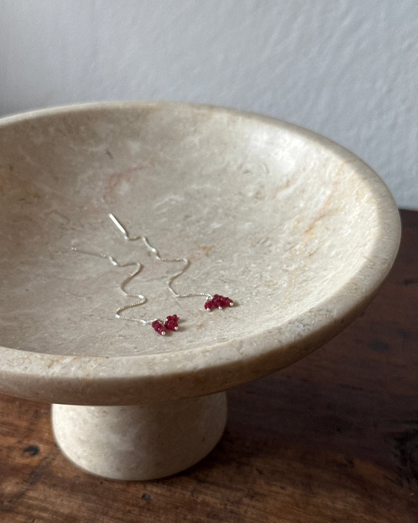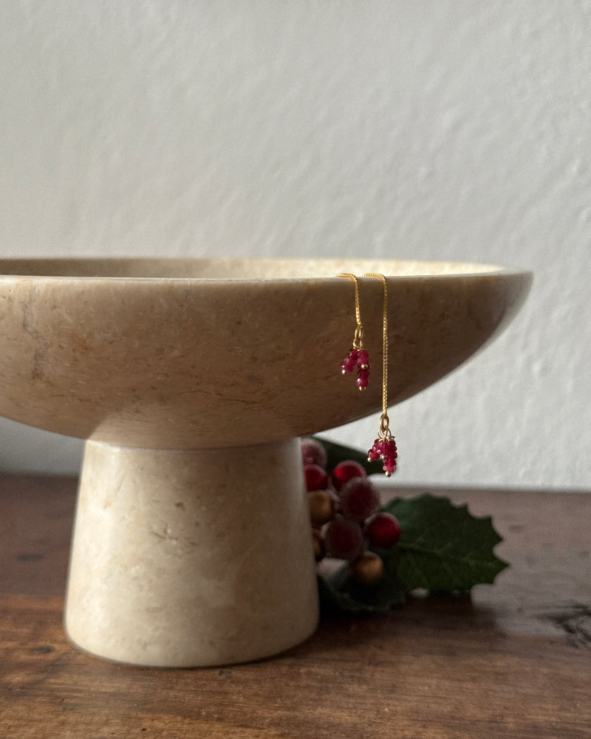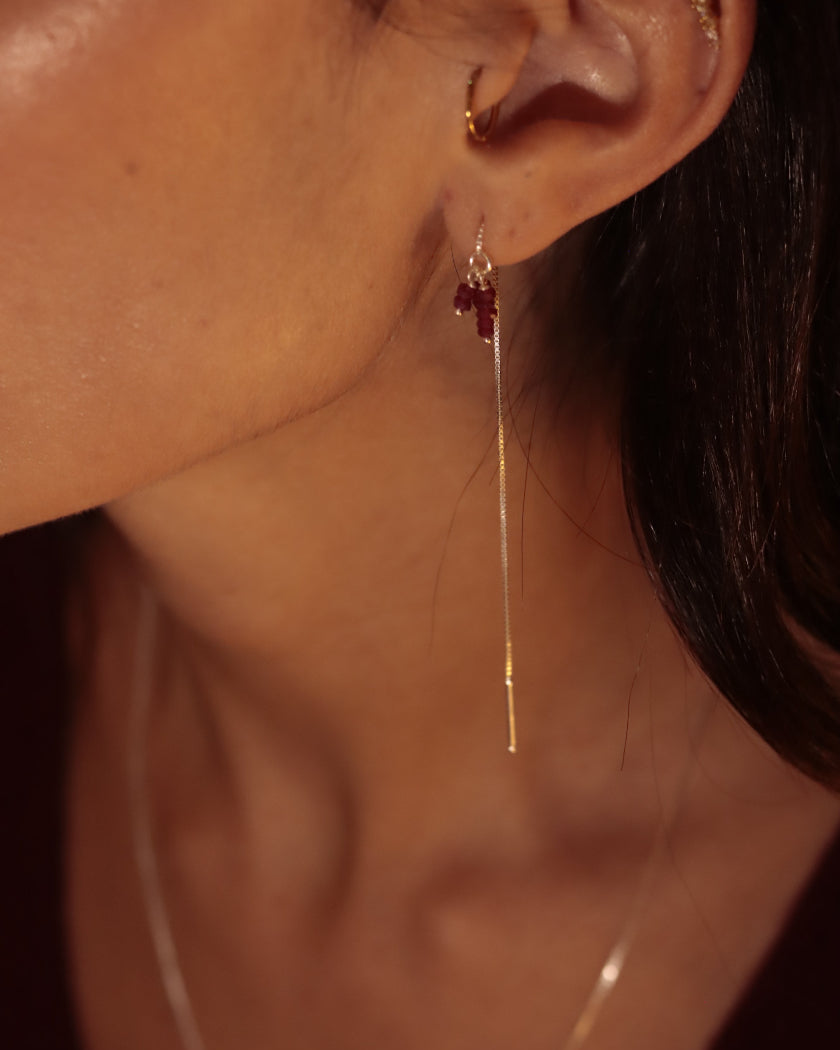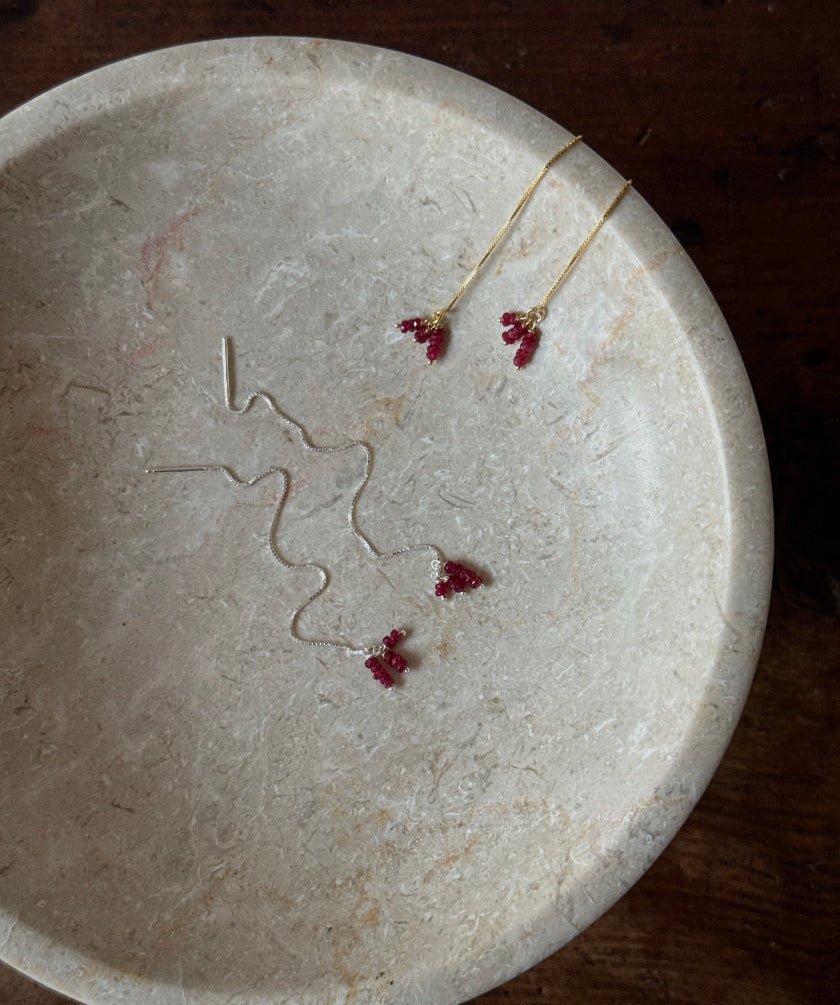 Orecchini saliscendi in argento 925 bianco o placcato oro 18kt con piccoli grappoli di rubini di alta qualità