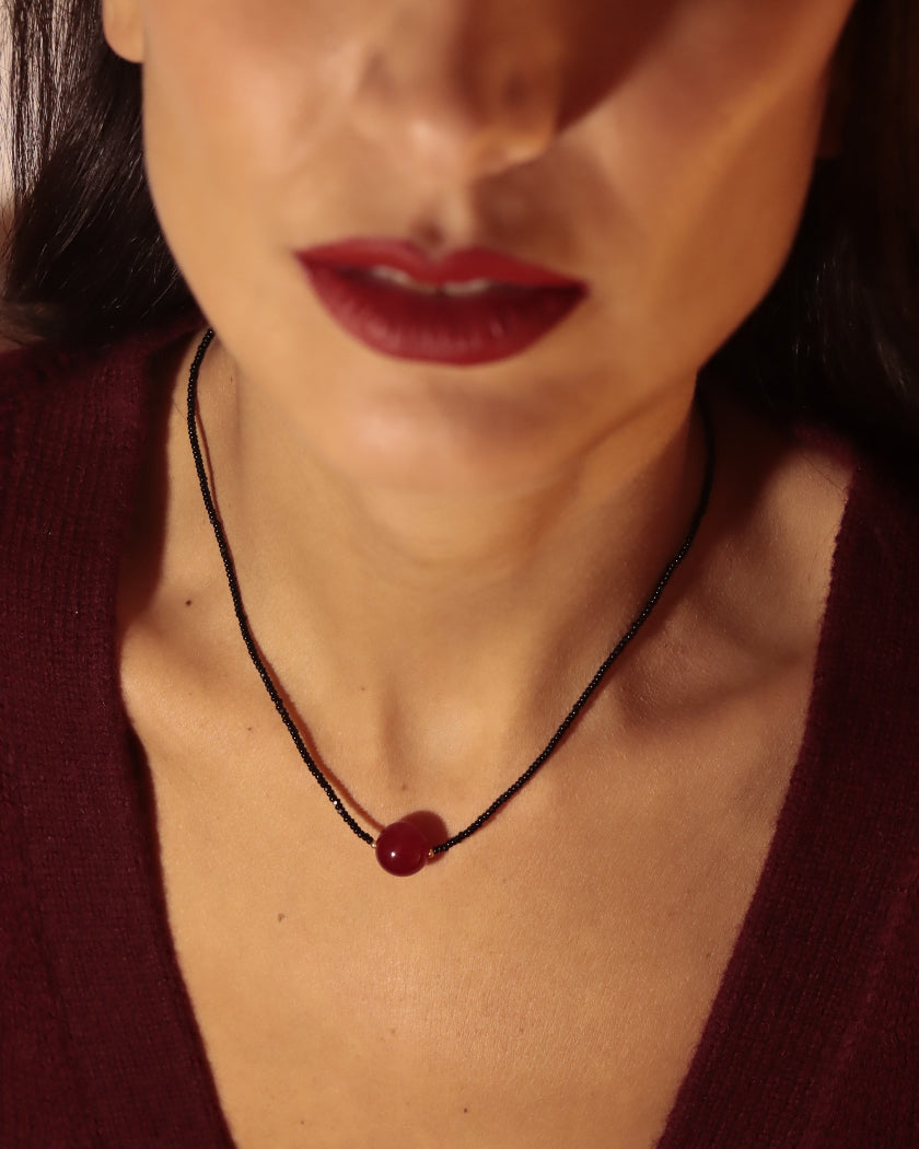 collana girocollo con cristalli di Boemia e una sfera di giada rossa al centro con finiture in argento 925 bianco o placcato oro 18kt