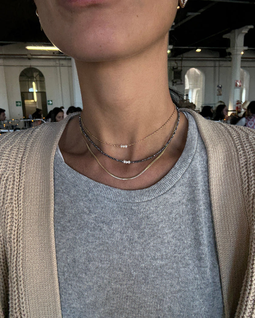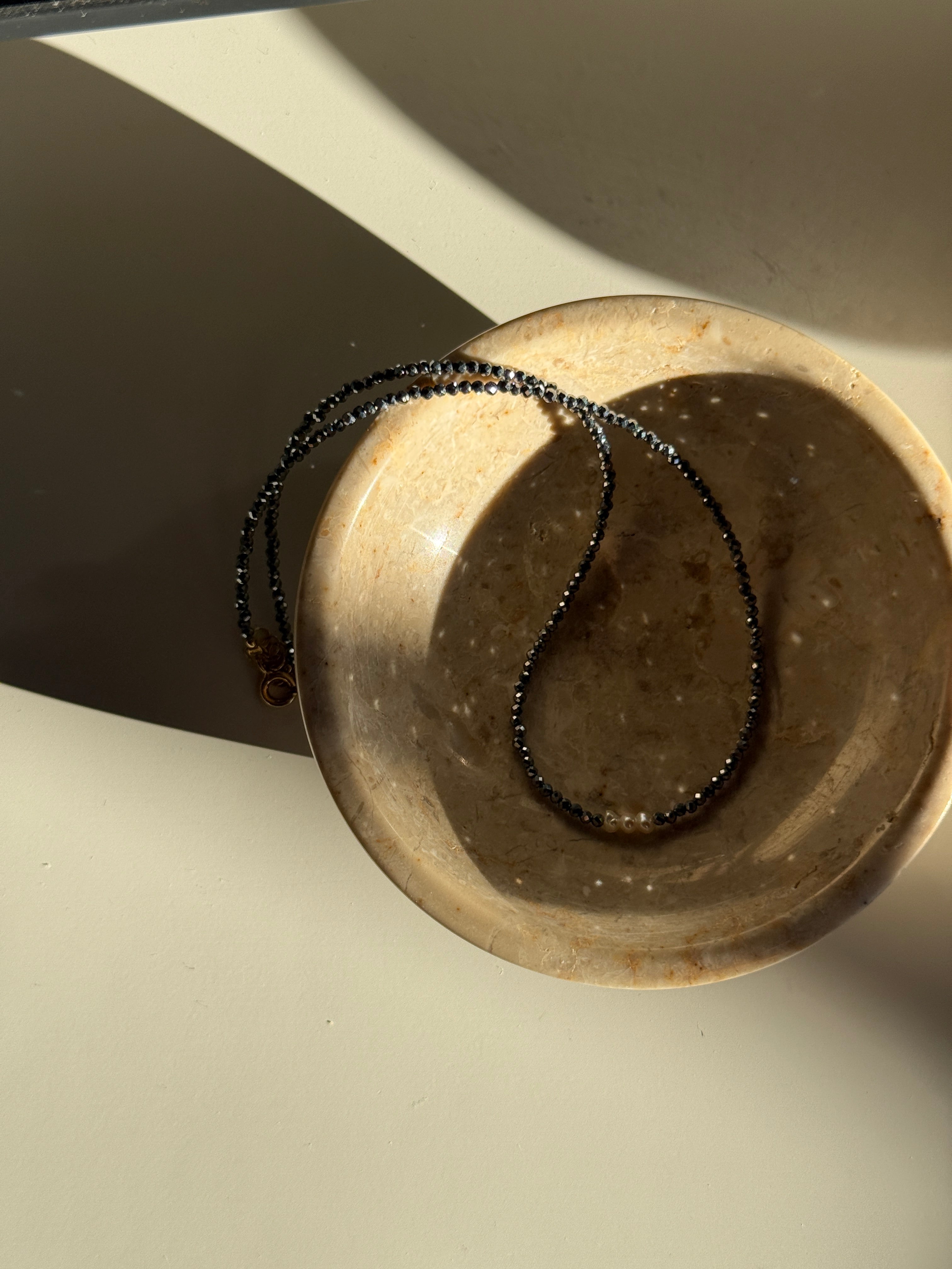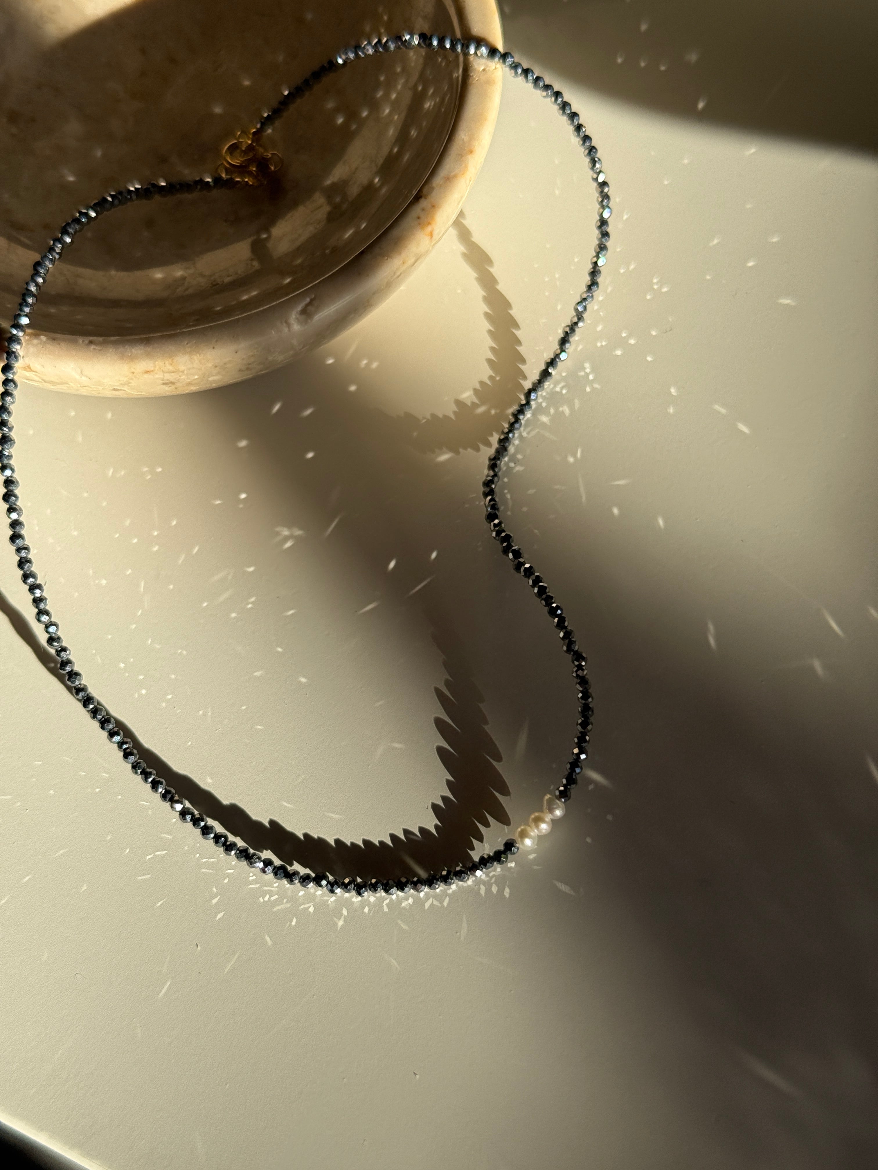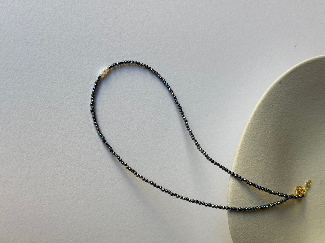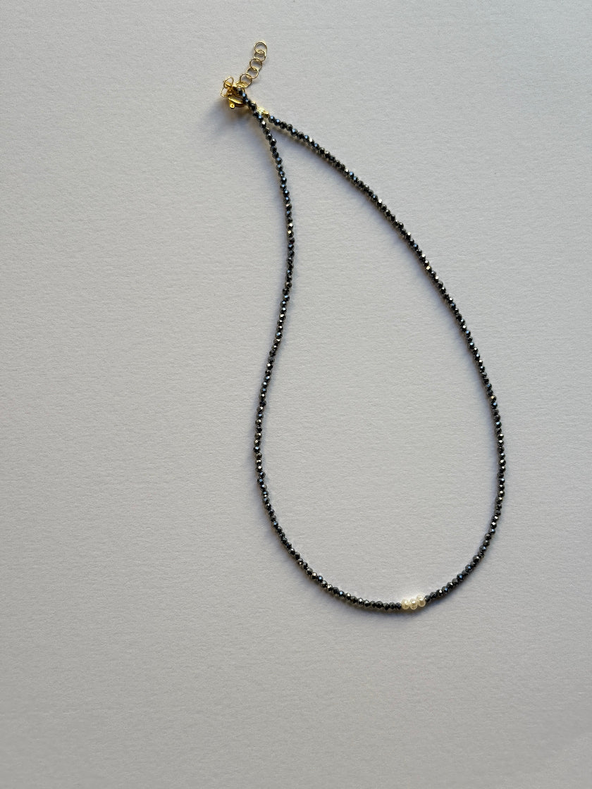 Choker realizzato con pietra di ematite, tre perle naturali al centro con finitura in argento 925 placcato oro 18kt