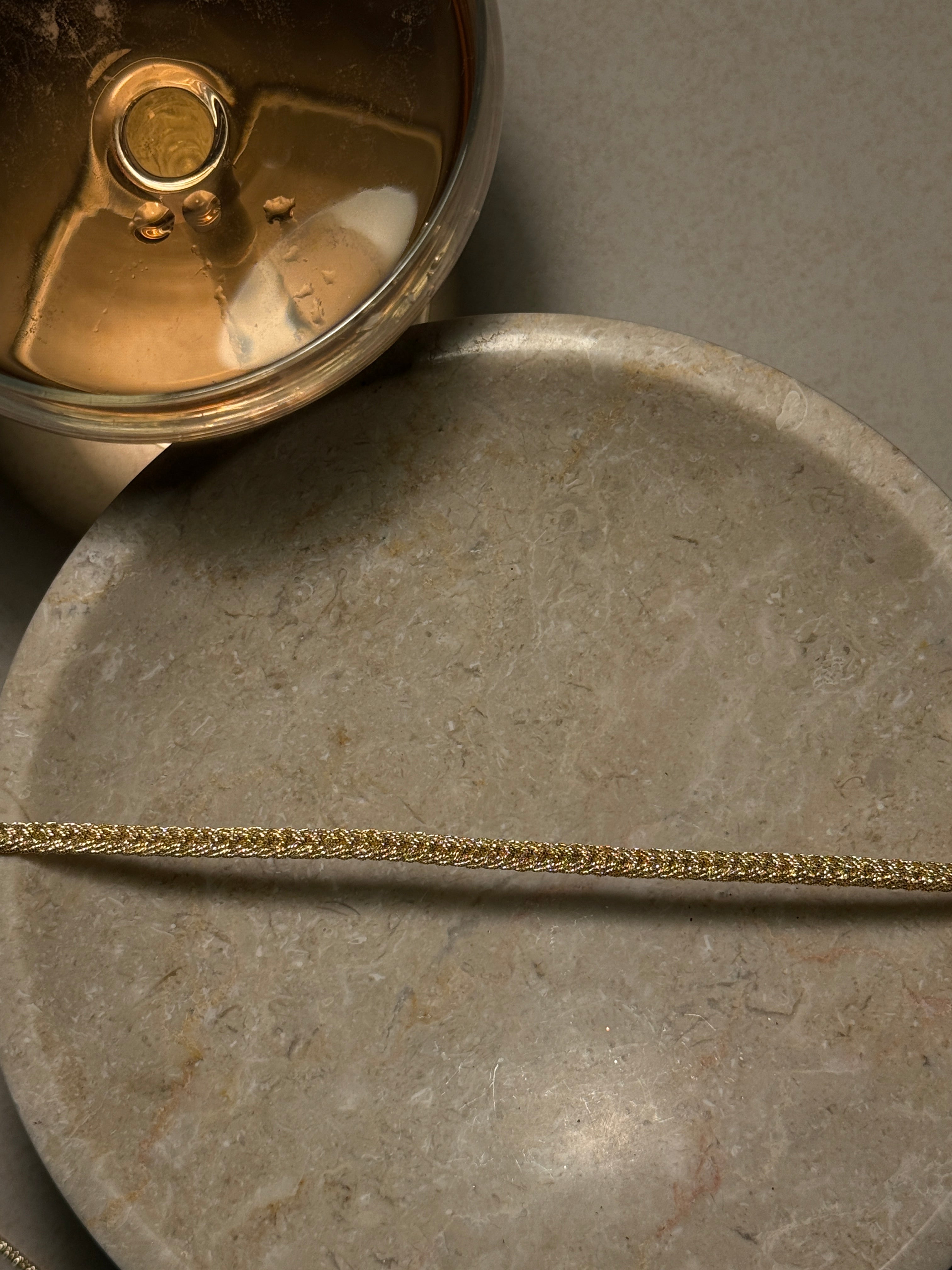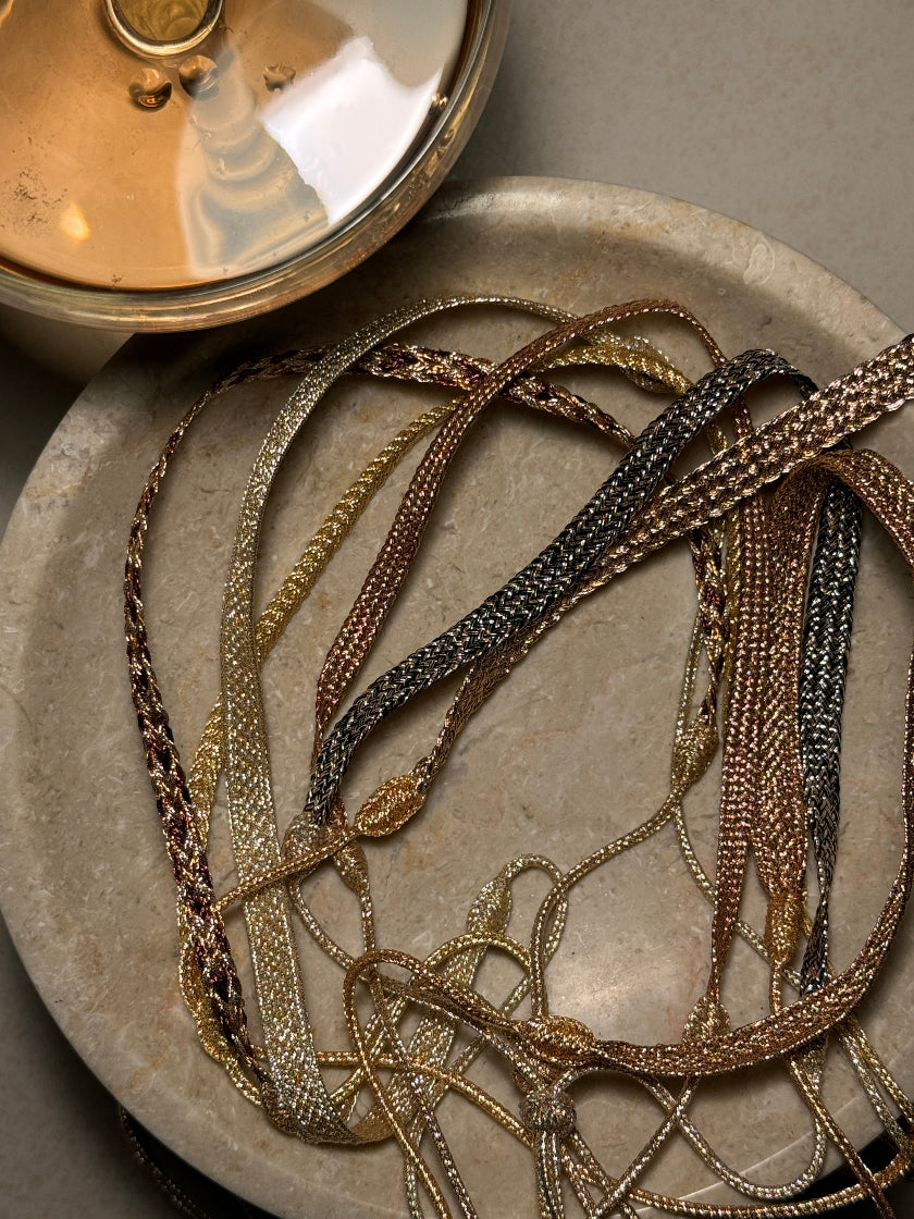 Ogni collana nasce da un intreccio accurato di fili metallici dorati, bronzo e altri colori che creano una texture morbida, luminosa ed elegante.