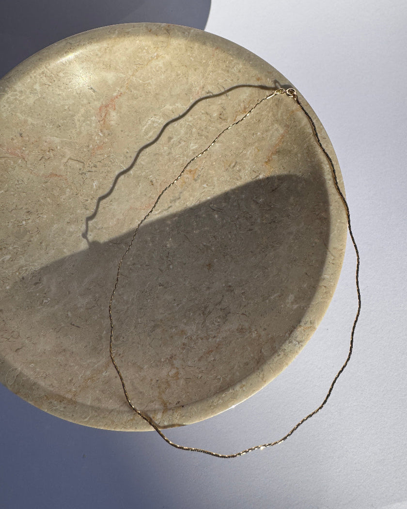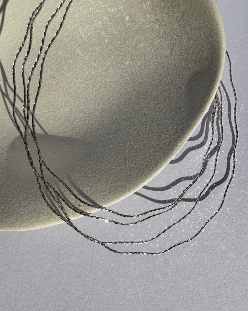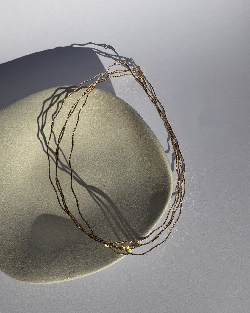 Luminosissima collana a filo con sinuosità morbide ed eleganti realizzata in argento 925 bianco o placcato oro 18kt
